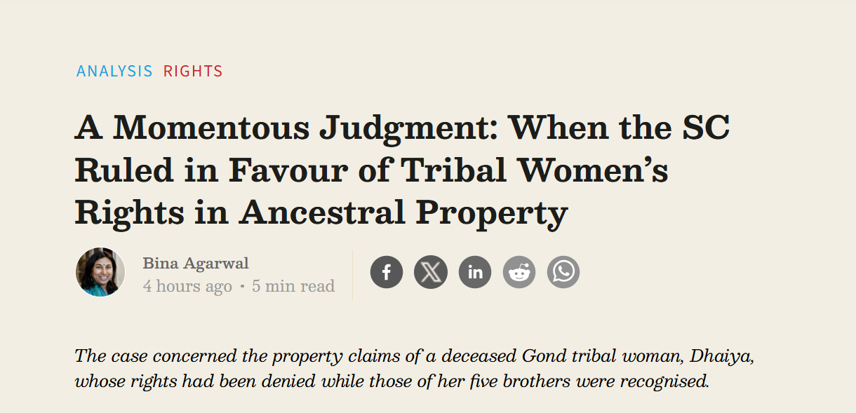 Agarwal, Bina, 2025. “A Momentous Judgment: When the SC Ruled in Favour of Tribal Women’s Rights in Ancestral Property,.” The Wire.